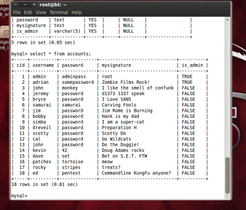 root@bt:~# cd root@bt:~# mysql -h 192.168.153.39 -uroot -psamurai -e "select * from nowasp.accounts" > account.txt root@bt:~# ls -l account.txt root@bt:~# date root@bt:~# echo "Tu nombre"