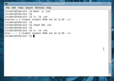 [student@fedora14 ~]$ mkdir -p .ssh [student@fedora14 ~]$ ls -ld .ssh [student@fedora14 ~]$ chmod 700 .ssh [student@fedora14 ~]$ ls -ld .ssh