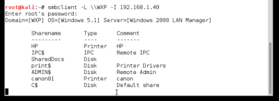 para buscar los nombre que utiliza la NetBIOS utilizaremos el comando nmblookup que realiza consultas de nombres NetBIOS y asignar direcciones IP en una red con NetBIOS sobre consultas de TCP/IP. Las opciones permiten las consultas de nombre ser dirigido en una determinada área de difusión IP o a una máquina en particular. Como se puede observar WXP es el nombre de estación de trabajo NetBIOS. Ahora tenemos la pieza final de reconocimiento para consulta NetBIOS acciones incluyendo las impresoras.