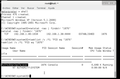 getuid getpid shell tasklist /v /fi "PID eq "1876" Cambia el PID por el que te ha salido con la sentencia getpid netstat -nao | findstr "1876"