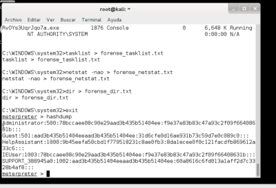 Comando 1, redirige la salida creada por TaskList en un archivo llamado forense_tasklist. txt. Comando 2, redirige la salida creada por netstat en un archivo llamado forense_netstat. txt. Comando 3, redirige la salida creada por dir en un archivo llamado forense_dir. txt. Comando 4, salimos del shell de comandos y vuelva a la solicitud de meterpreter.