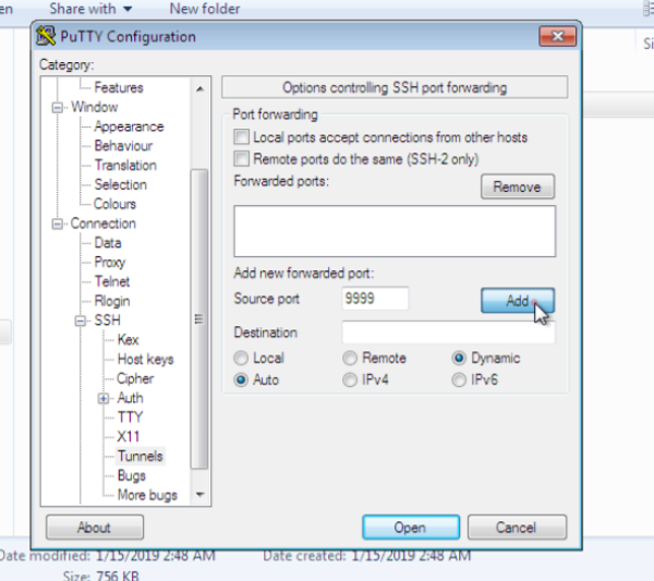 Click en Connection --> SSH --> Tunnels Click en el boton de Auto Source port: 9999 Click en el boton de Dynamic Radio Click en el boton de Add