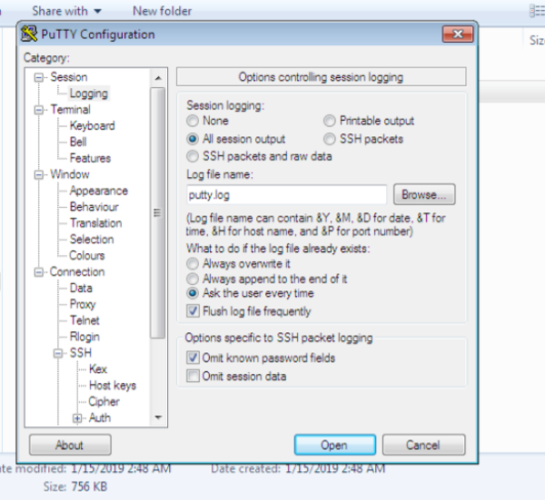 Click en Session --> Logging Session Logging: Click en el boton "All session output"