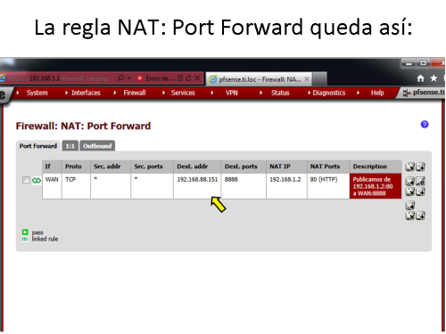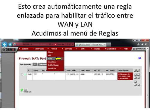 Publicación de un servidor WEB (escuchando en el puerto 80) ubicado en la LAN hacia la WAN variando el número de puerto de publicación para que sea el 8888 en la red externa