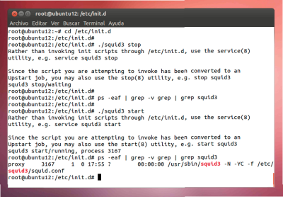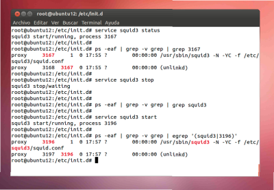 Parar e iniciar el servico squid3 con el comando "service"
