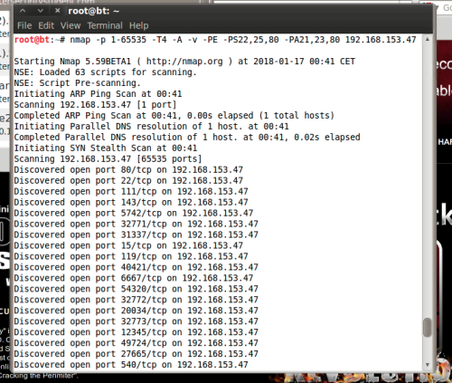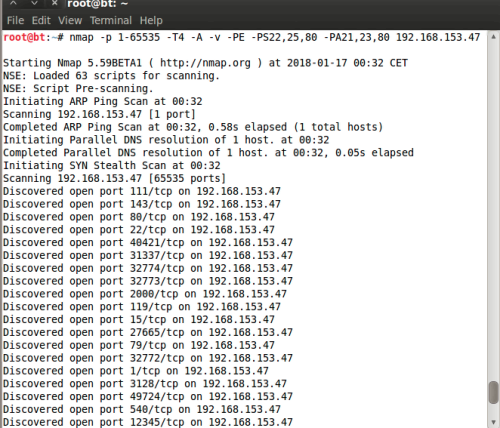 root@bt:~# nmap -p 1-65535 -T4 -A -v -PE -PS22,25,80 -PA21,23,80 192.168.153.47