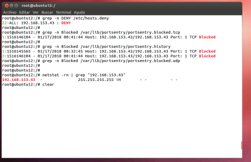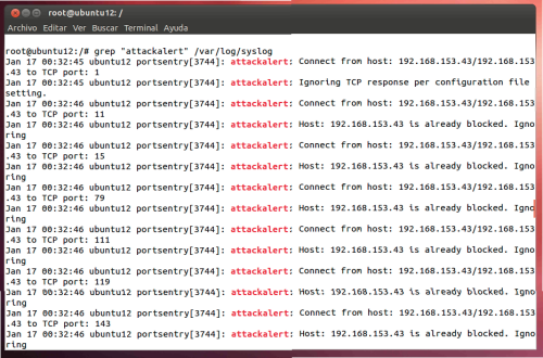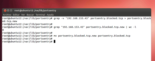 root@ubuntu12:/var/lib/portsentry# cd /var/log root@ubuntu12:/var/log# grep portsentry syslog | awk '{print $6}' | sort | uniq -c root@ubuntu12:/var/log# date root@ubuntu12:/var/log# echo "tu nombre"