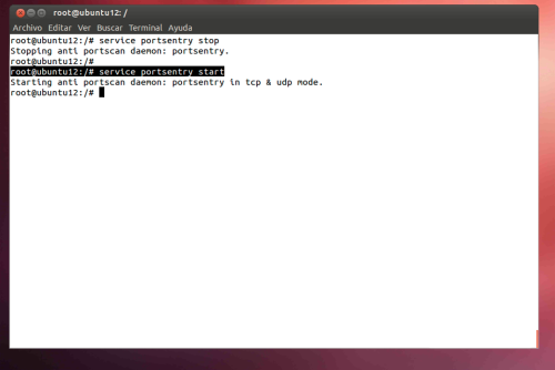 root@ubuntu12:/# service portsentry stop root@ubuntu12:/# service portsentry start