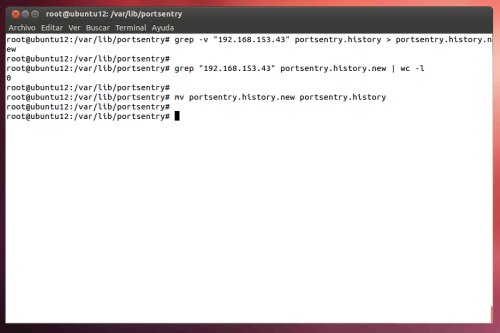 root@ubuntu12:/# service portsentry stop root@ubuntu12:/# cd /etc/ root@ubuntu12:/etc# grep -v "192.168.153.43" hosts.deny > hosts.deny.new root@ubuntu12:/etc# grep "192.168.153.43" hosts.deny.new | wc -l root@ubuntu12:/etc# mv hosts.deny hosts.deny.old root@ubuntu12:/etc# mv hosts.deny.new hosts.deny