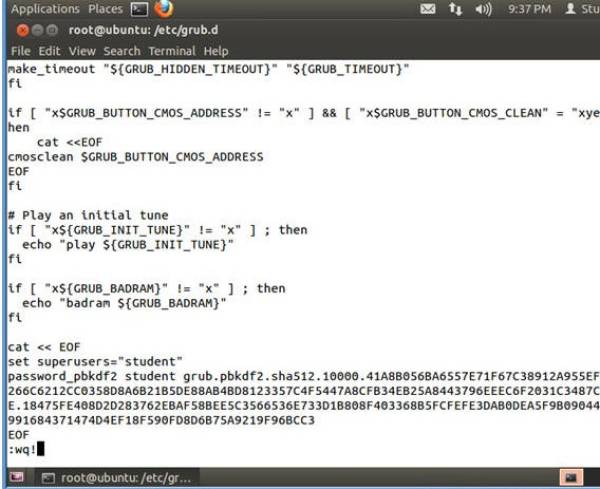 root@ubuntu:/etc/grub.d# grub-mkpasswd-pbkdf2 Enter passwdord: Reenter password: Your PBKDF2 is grub.pbkdf2.sha512.1000.8D......